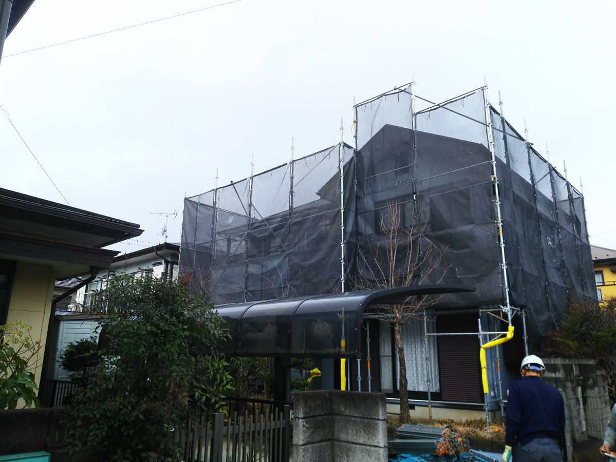 まずは、安全かつ効率的に作業を行うため、建物全体を囲うように仮設足場を設置しました。隣接する建物や歩行者への配慮として、メッシュシートで飛散防止対策も徹底しています。