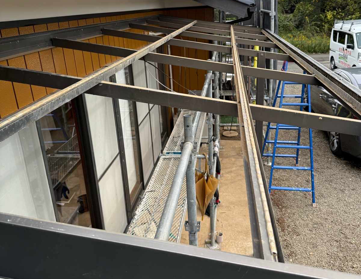 既存のポリカ屋根を撤去し、あわせて下地や固定部分の状態もしっかりと確認していきます。
