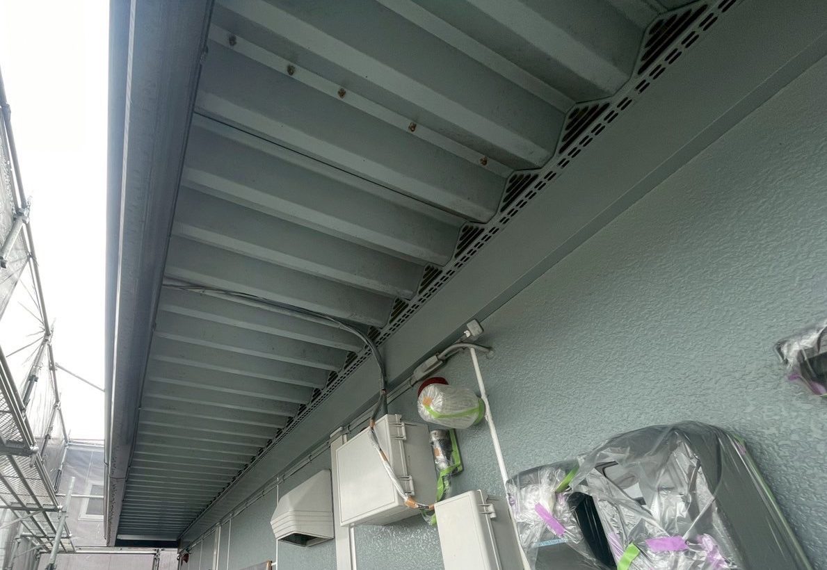 調査写真では、鉄骨造の軒裏にわずかな色ムラや汚れが見られ、