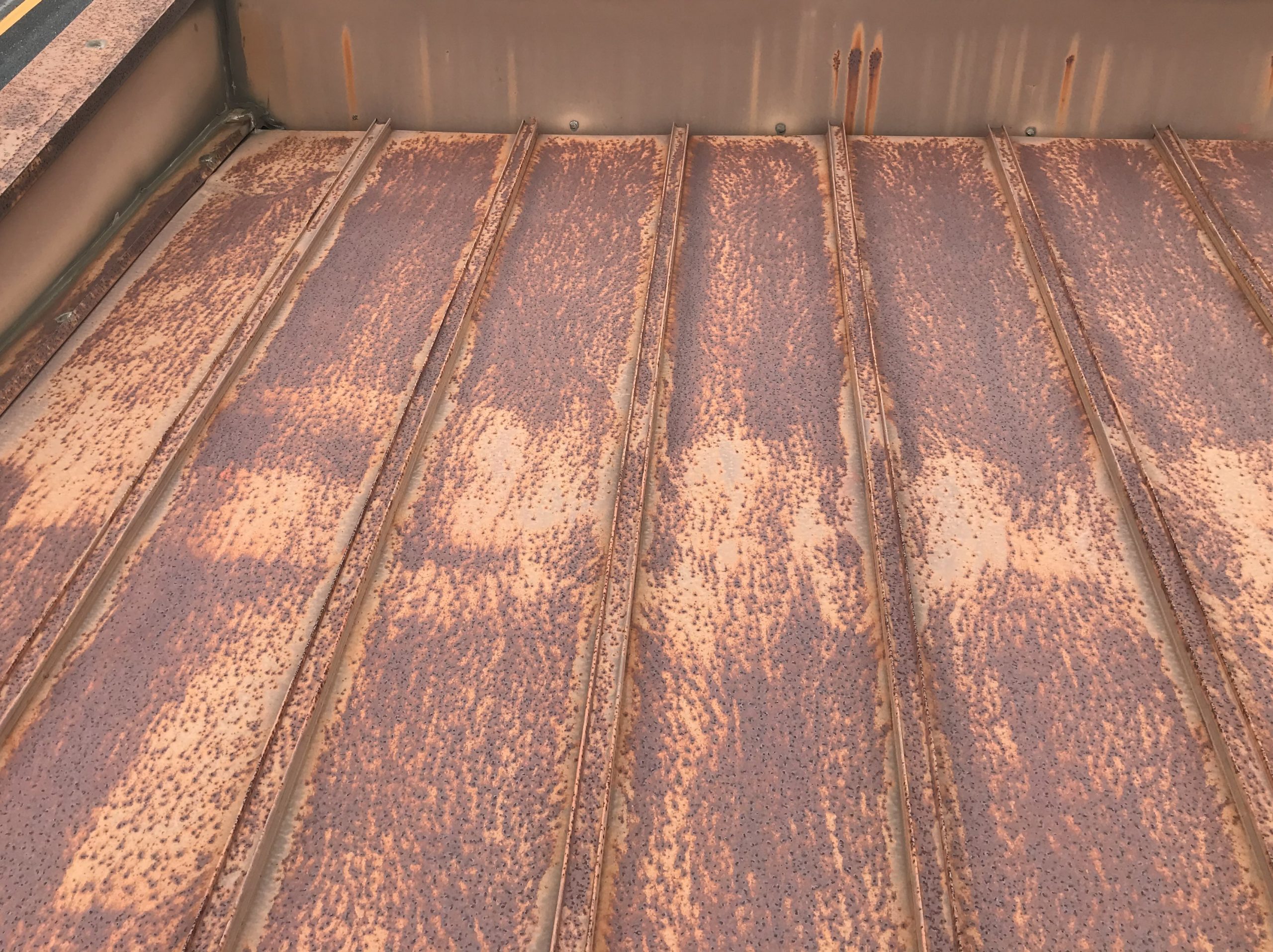 調査では、屋根全体に赤錆が均一に浮き出ており、長期間の風雨による腐食が進んでいる状態がはっきりと分かりました。鋼板の表面だけでなくジョイント部分にも錆が入り込んでおり、放置すれば穴あきにつながる危険がある状況でした。このような状態では補修よりもカバー工法が適していると判断できます。
