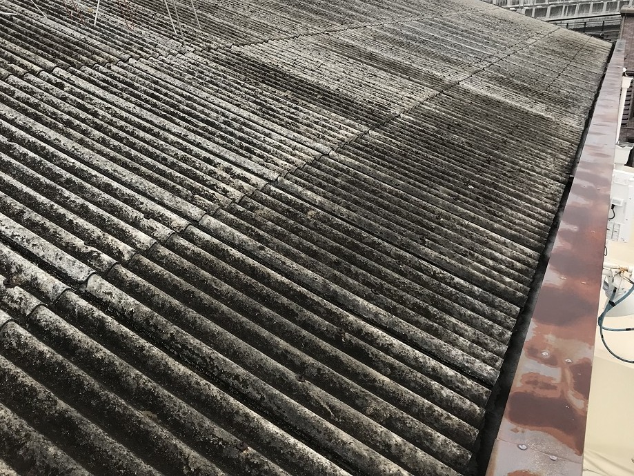 屋根全面にわたって苔や汚れが付着している様子が確認できました。長年雨水を受け続けたスレートは、表面がざらつきやすく、汚れが定着しやすくなります。そのまま放置すると吸水性が高まり、雨漏りのリスクも増すため、早めの対策が必要な状態でした。