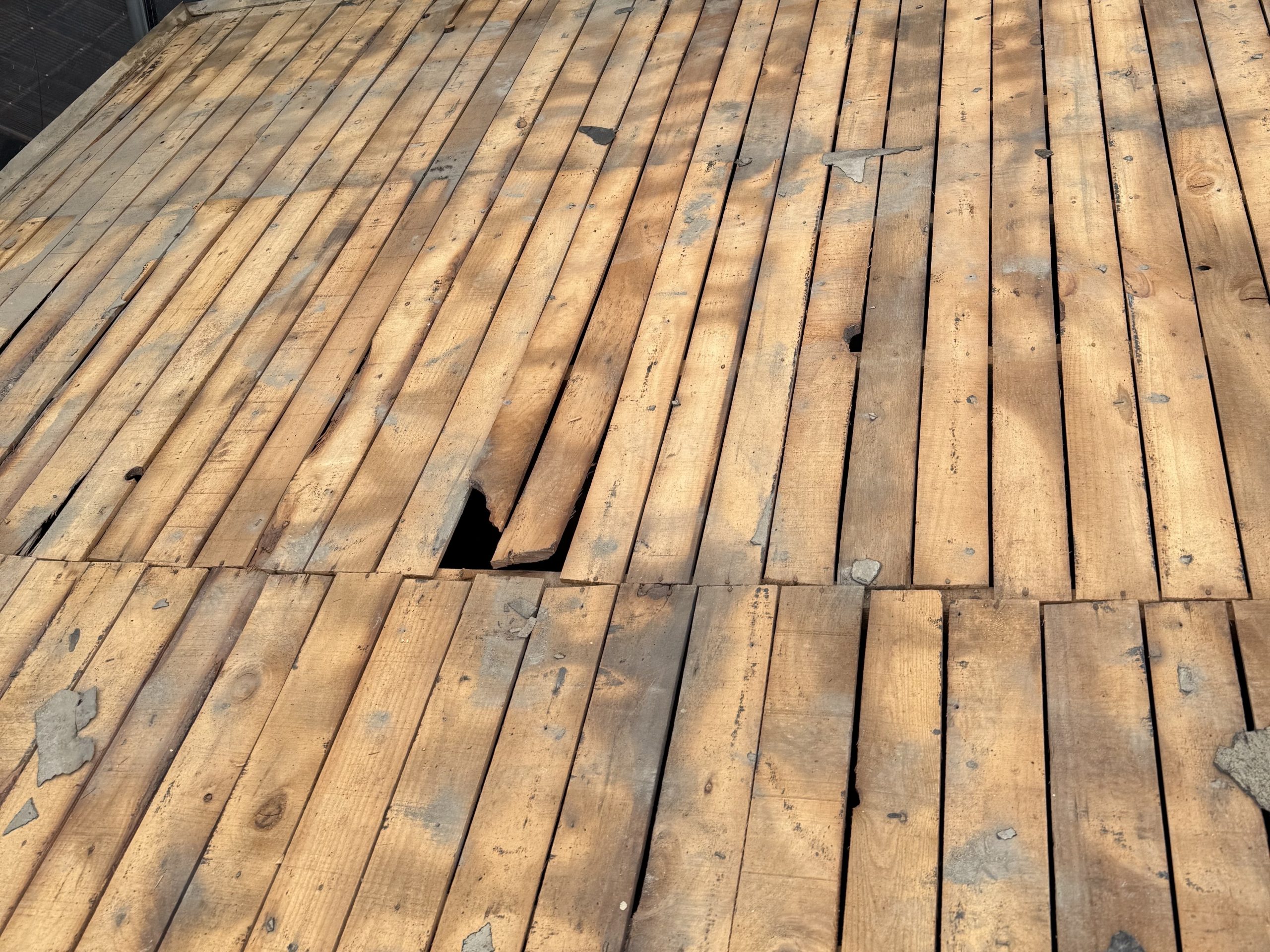 既存の屋根下地には、細い木材(バラ板)が使われていましたが、