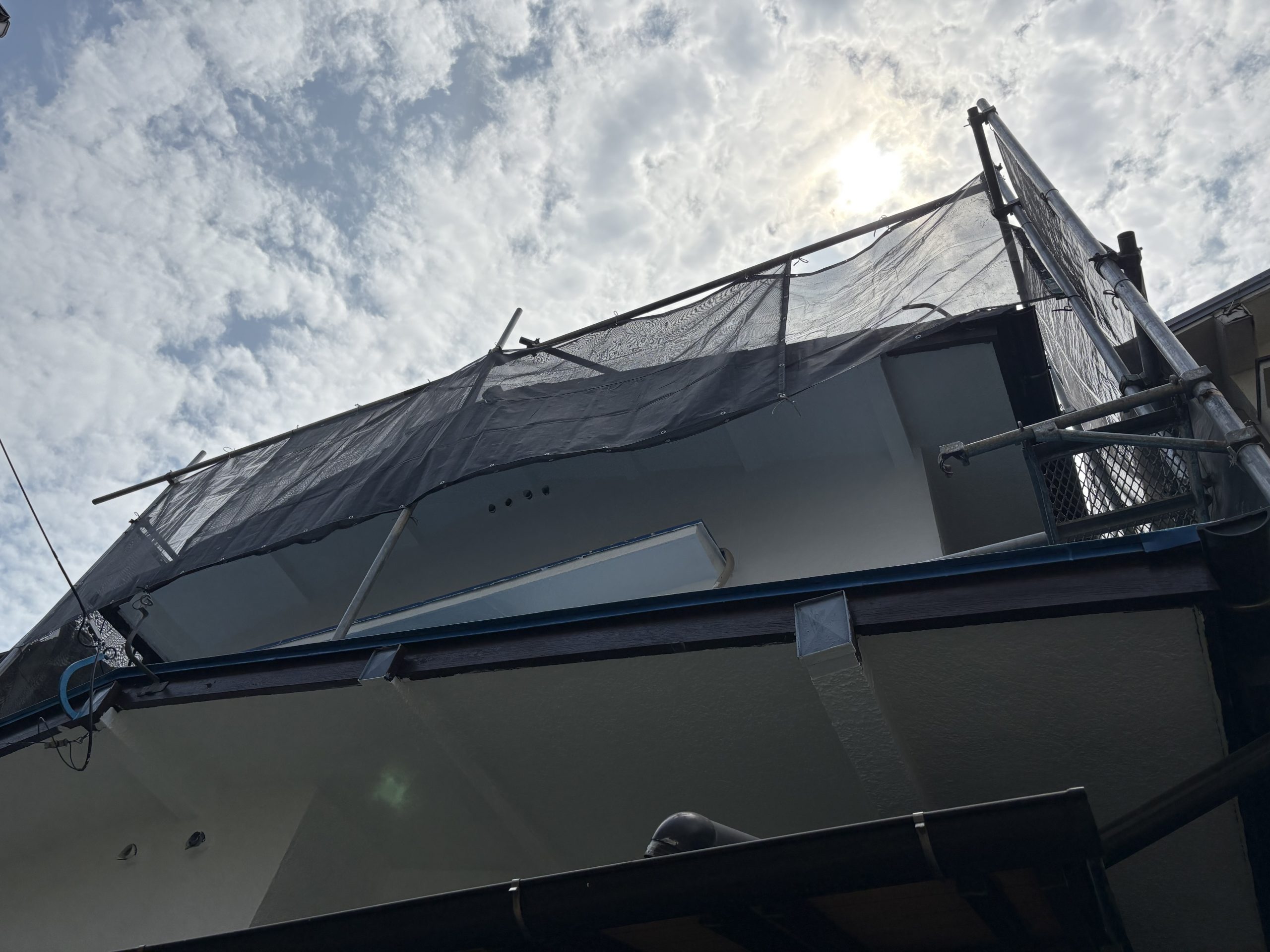 足場にはメッシュシートを張り、粉塵飛散や落下物への対策も万全です👷