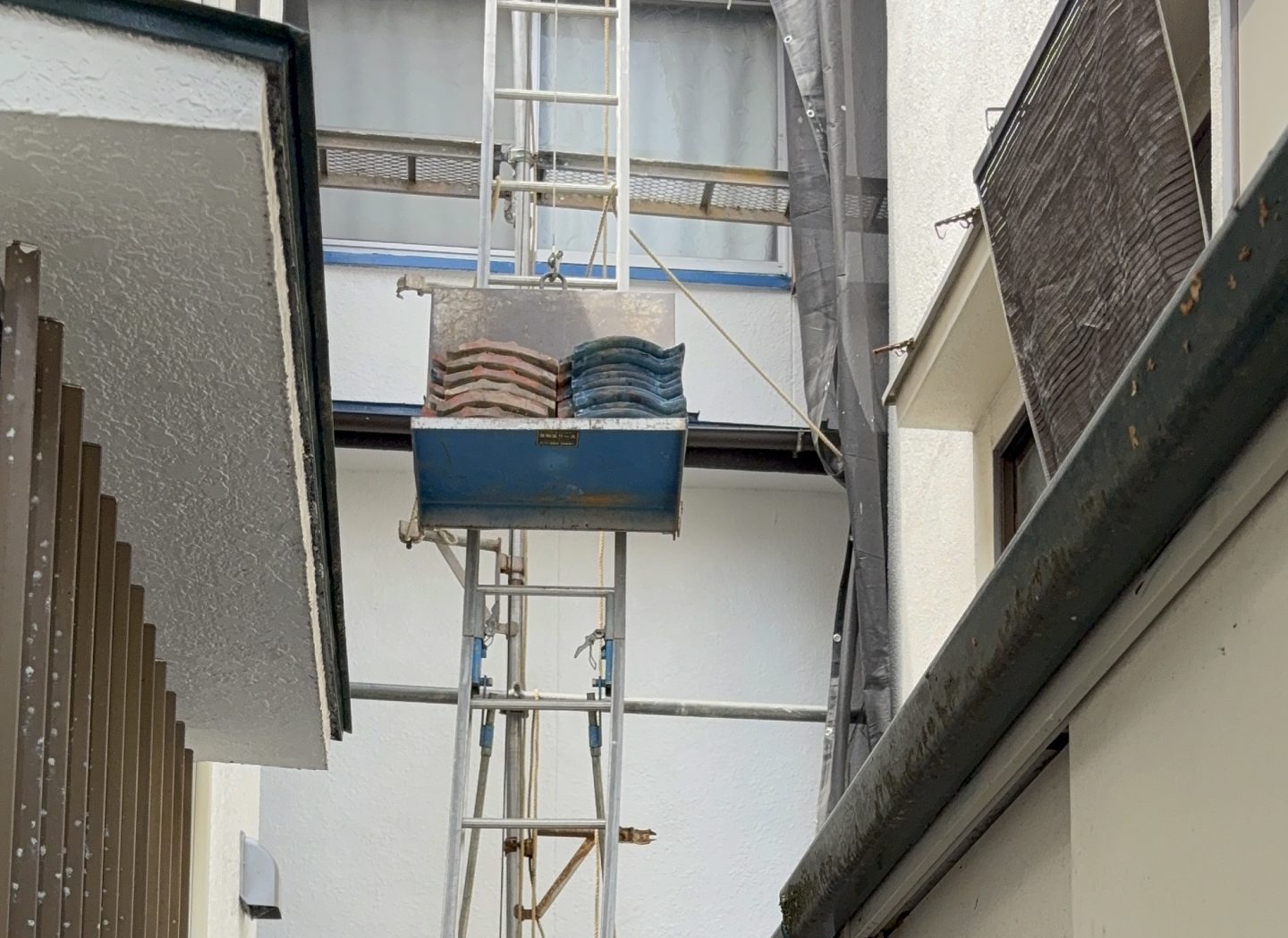 狭小地ということもあり、昇降機を使ってスムーズに瓦を搬出しています。