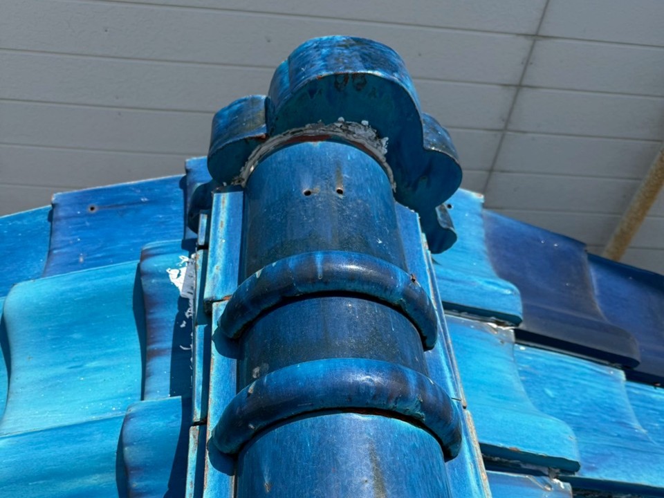 瓦全体に歪みや浮きが見られ、棟瓦を固定している銅線が劣化により切れている状態でした。
