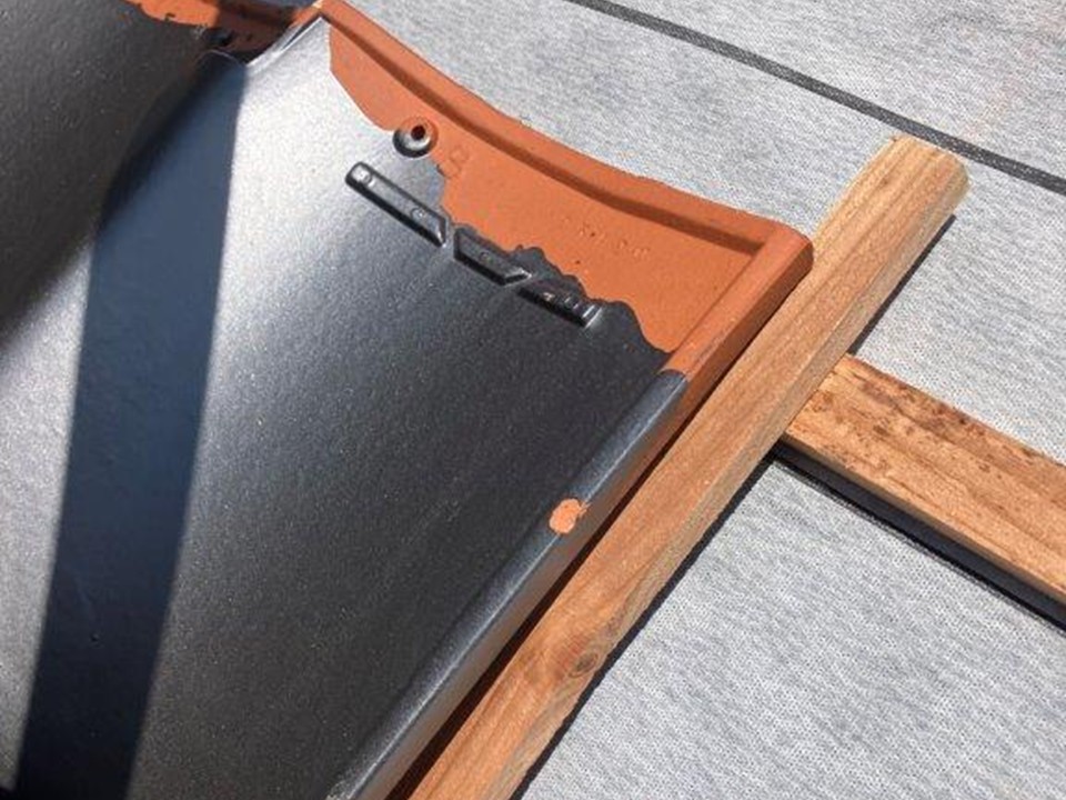 →棟部分の釘が抜けていたり、銅線が切れていることで、棟瓦がずれています。