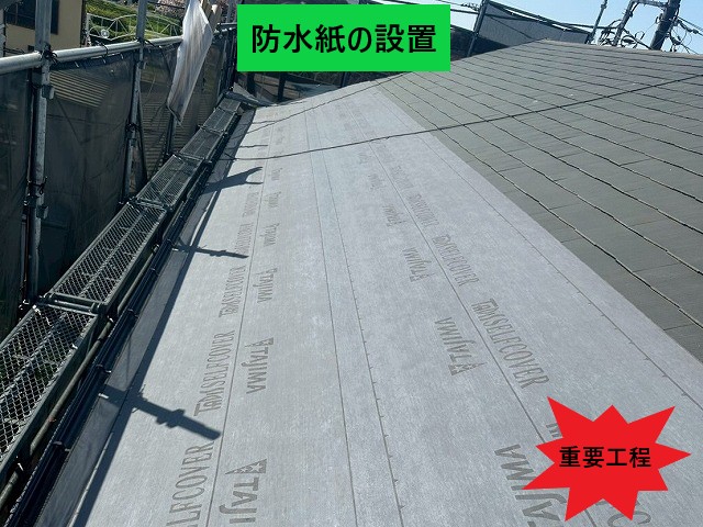 屋根の防水性能の“要”となる、防水紙を敷設していきます。
