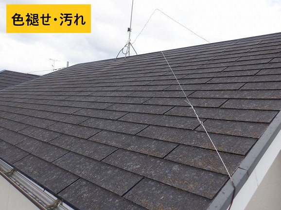スレート屋根は塗膜が弱くなると防水性が落ちるため、ひび割れこそないものの早めのメンテナンスが望ましい状態です。