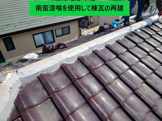 保管しておいた棟瓦を元に戻し、一枚一枚、丁寧に固定していきます。