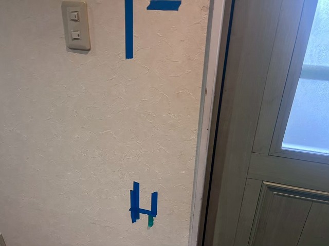 手すりを取り付ける位置の壁面下地の様子を確認し、しっかり固定できる位置を見極めました。そして、手すりを取り付ける位置にマスキングテープで印をつけました。
