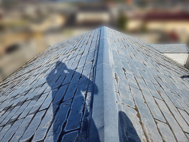 屋根材にはスレートが使用されており、長年の紫外線や雨風の影響により塗膜の劣化がみられました。