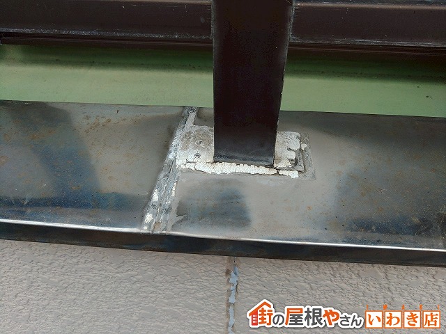 この笠木の継手部分や手すりを取り付けた根元部分のシーリングが劣化して、亀裂やひび割れが起きているのを確認しました。