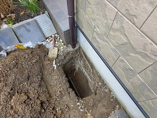 地中にある既存の配管の位置を確認し、新しい配管を取り付ける位置を決めてから既存の配管をカットしました。