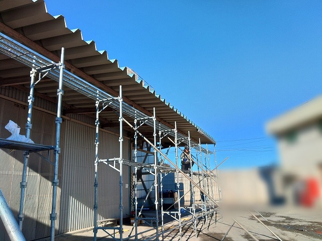 今回の工場の屋根は高さがあるので軒先部分に足場を組んで作業が行いやすくなるようにします。