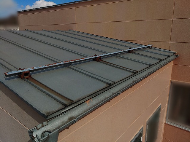 屋根は瓦棒葺き(かわらぼうぶき)屋根になっていました。屋根自体にはそこまで酷い劣化はしていなかったのですが、錆が進行していました。中でも雪止めのアングルを固定している金具部分の錆び付きがとても進んでいるのを見つけました。