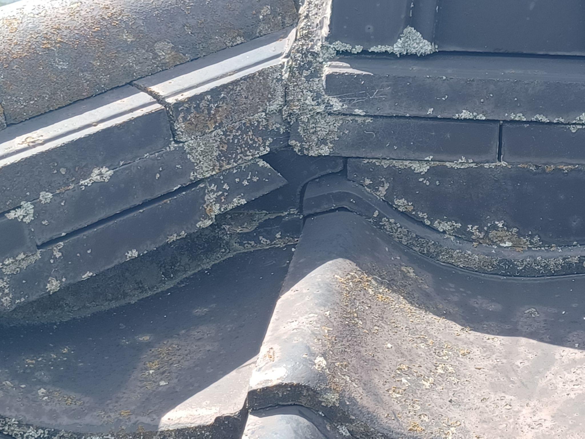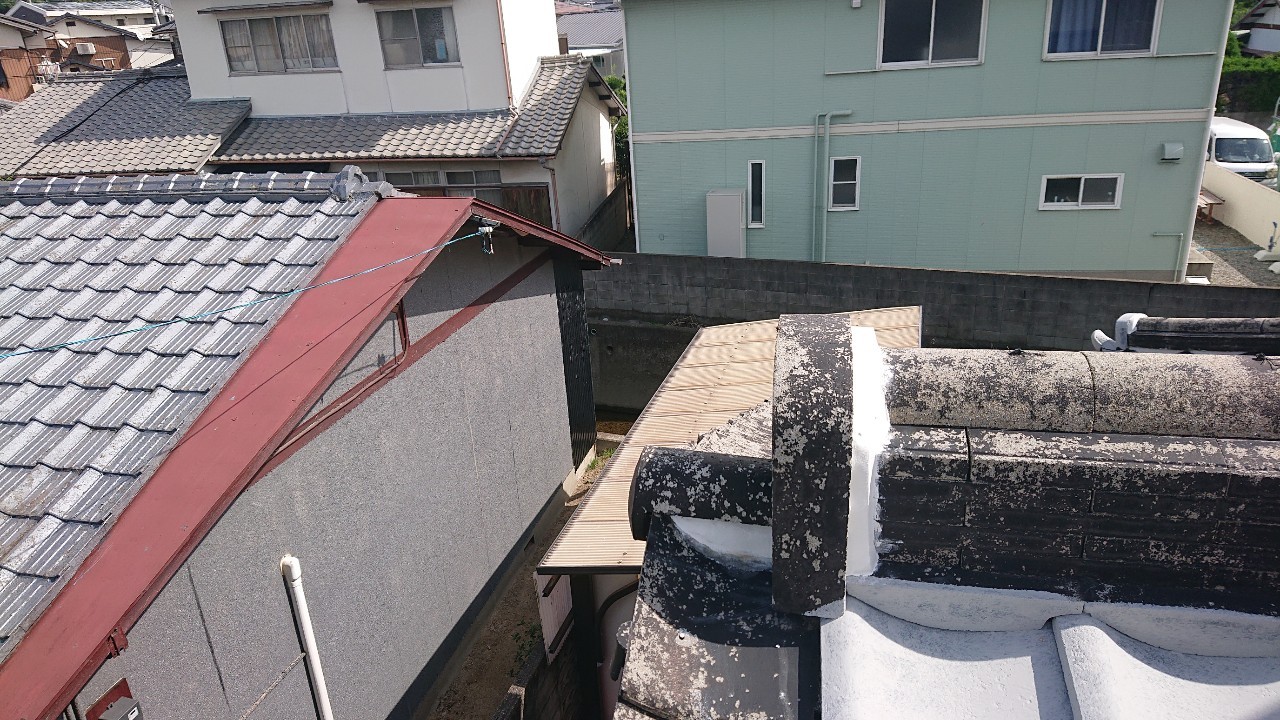 聞いていた通りセメント瓦の表面にはカビが発生しており、瓦の割れ、漆喰の剥がれなど傷みが多くの場所で見られました。