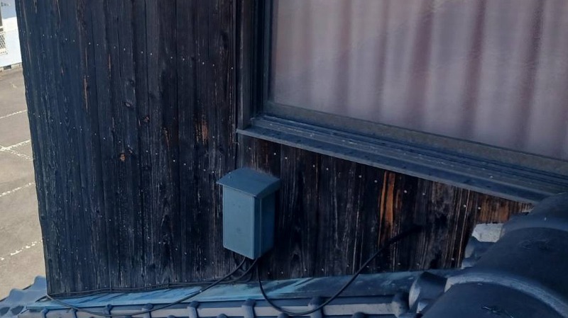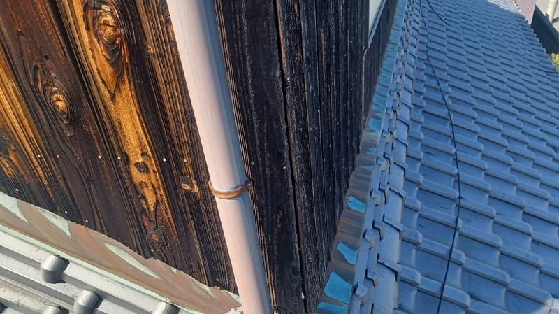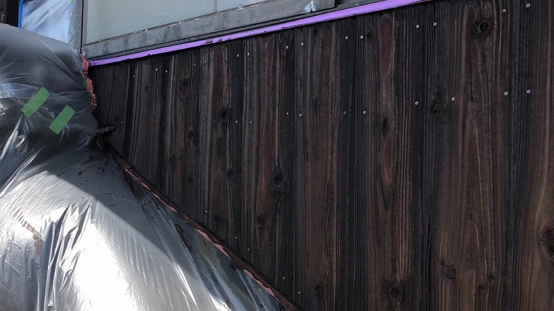 現地調査を行うと、外壁に使用されている焼き杉板(やきすぎいた)は、表面を保護する**塗膜(とまく:塗装によって木を保護する膜)**が、ほとんど残っていない状態でした。