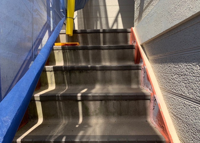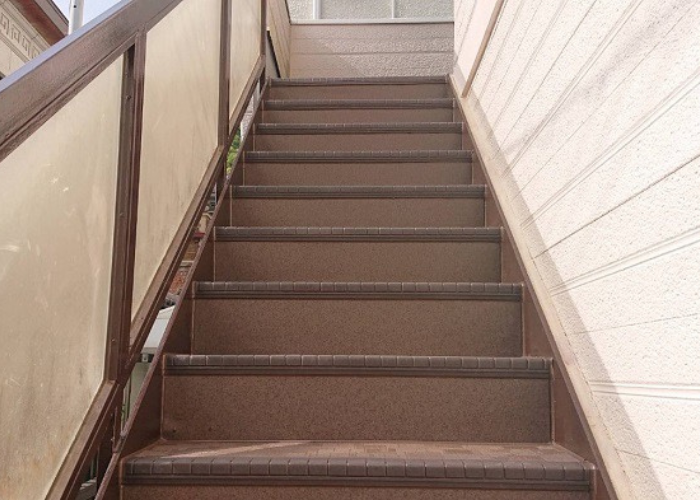 築35年の2階建て鉄骨造アパートで、階段18段、廊下約18㎡が施工対象でした。
