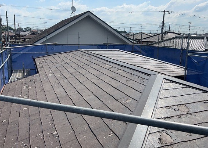 既存のスレート屋根は、表面の塗膜が広範囲で傷んでいる状態でした⚠️