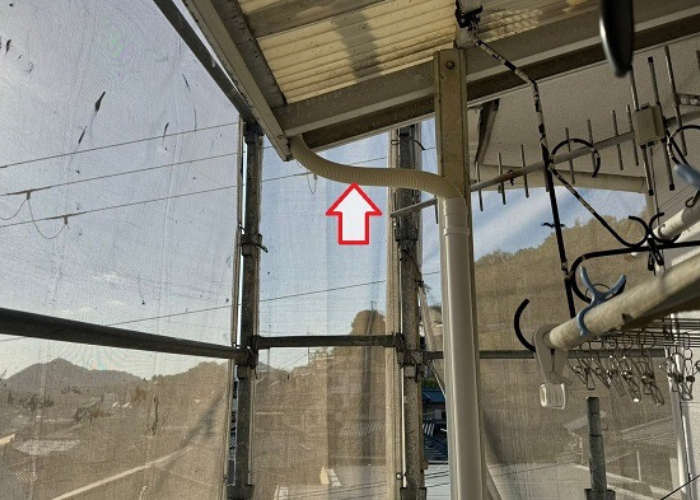 アルミフレームにアクリル屋根が付いているタイプの場合、屋根の雨水をベランダ床まで流すための排水配管が取り付けられています。