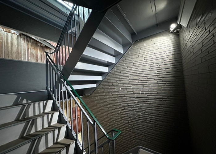 大阪市の3階建てアパートでは、1階から3階までつながる鉄骨階段が設置されています。👷♂️🔎