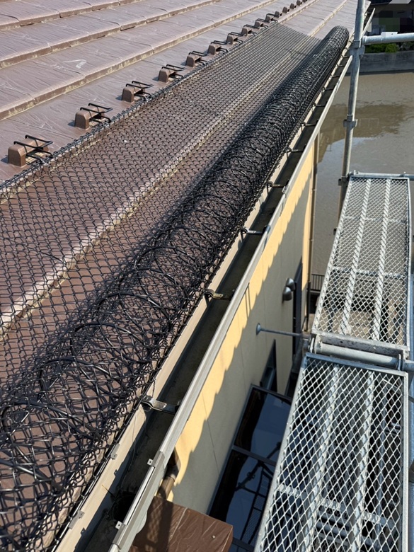 雪止めネットの「ゆきもちくん」をサンルーム上の瓦屋根の一部に設置していきます!