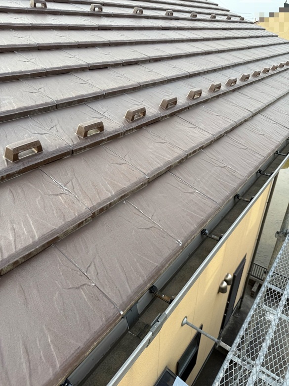 黄色〇で囲んである瓦屋根の雪止め瓦にゆきもちくん専用の止め金具を引っ掛けて固定していきます。
