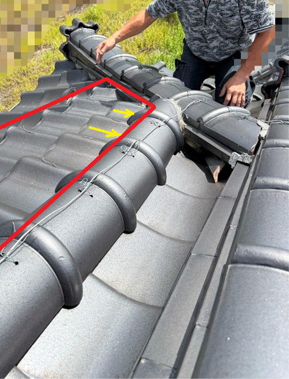 下り棟の横に設置されている平瓦の傾きが、一部矢印方向になっており、雨水が棟瓦の部分から屋根の内部に侵入していたと考えられます。
