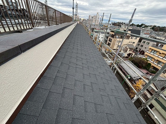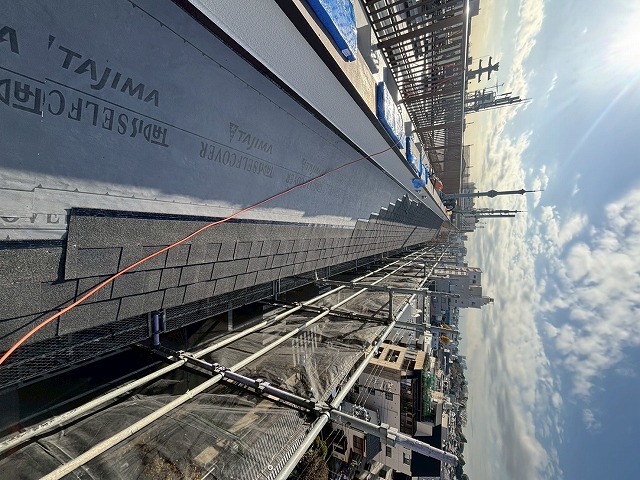 続く写真では、防水シートが屋根一面にきれいに敷かれた様子が確認できます。今回使用したシートは耐久性に優れた製品で、雨水の侵入を二重に防ぐ大切な工程です。シートの重ね幅を均一に保ちながら張ることで防水性が高まり、見た目にも整った仕上がりになりました。