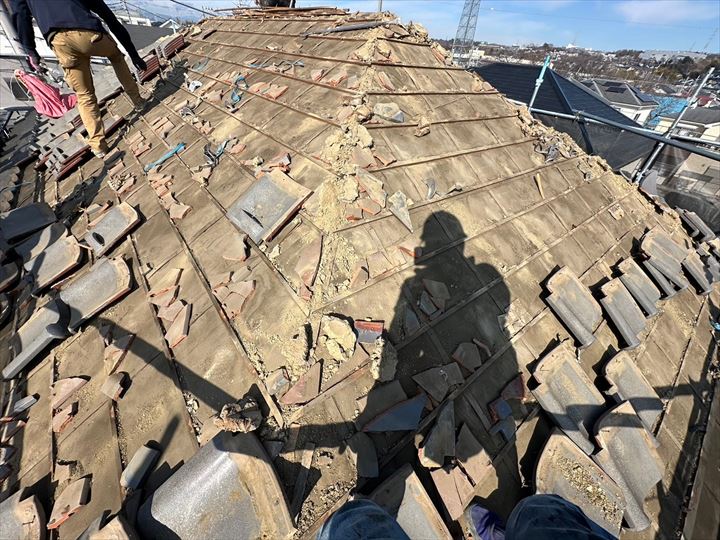 今回は相模原市中央区宮下本町で「築年数が経ってきたので屋根のメンテナンスを考えているから見積りが欲しい」とご連絡をいただいたことが工事のきっかけでした。調査のために瓦を何枚か開けてみると防水紙が破れてしまっているところがありました(-_-;)