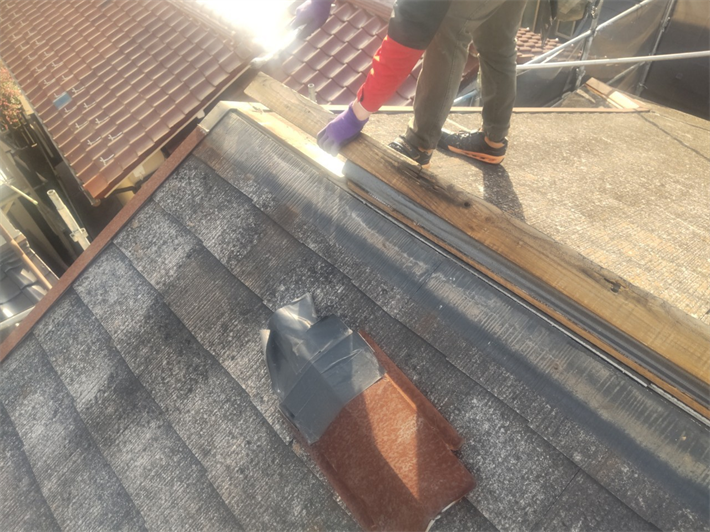 先ずは既存の棟板金をバールなどの工具を用いて丁寧に剥がします。