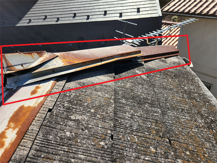 棟板金は屋根の頂上部分に設置されておりますので風の影響を受けやすい部分になります。
