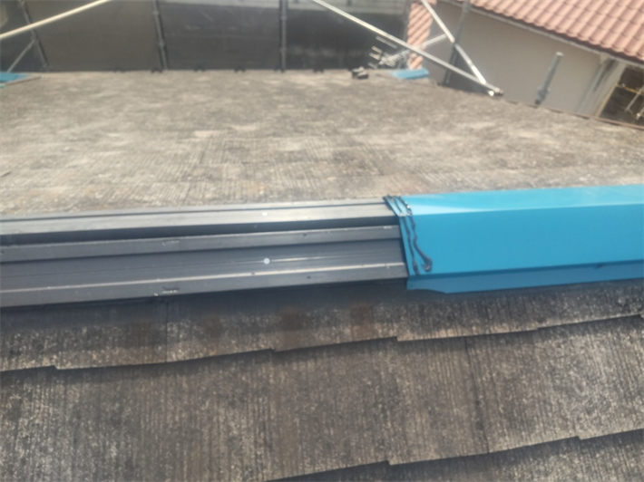棟板金が外れてしまうと屋根材のスレートの下に敷設されている防水紙が露出してしまい、雨漏りに繋がりますので早期対応が必要になりますので、調査後、屋根の状況をS様にご報告し、棟板金交換工事のご提案をさせていただいたところ、工事のご依頼をいただきました。