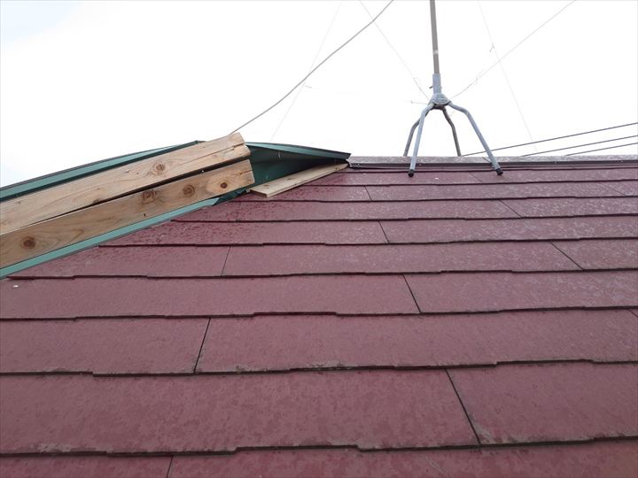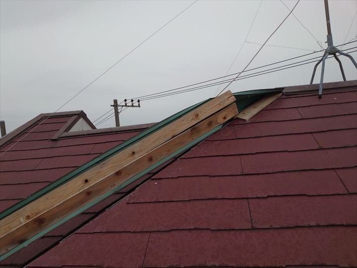 屋根に登ってみると、棟板金の下地である貫板ごと剥がれてしまっているのが確認できました。