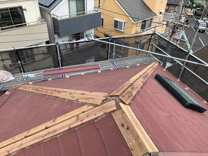 棟板金を撤去した後に現れるのが貫板です。