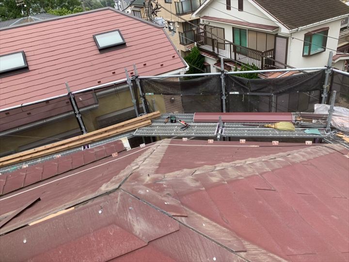 足場の仮設工事が完了したら、まず棟板金の撤去です。