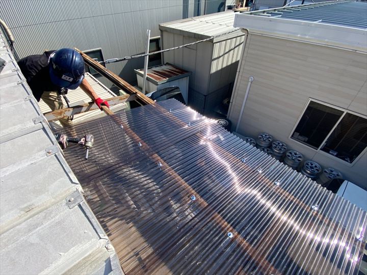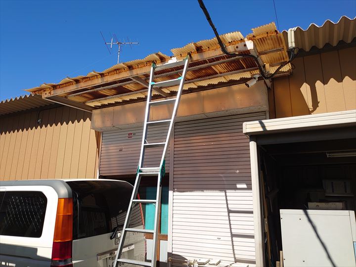 梯子を架けて端のほうから既存の波板を撤去していきます。