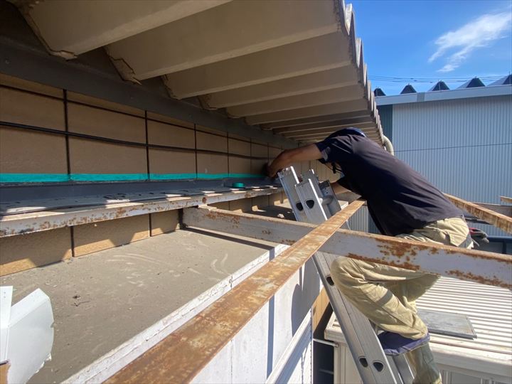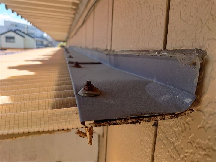 他にも波板がバタつかないように外壁との取り合い部分に雨押え板金が設置されていましたが、雨押え板金の立ち上がり部分のコーキングも劣化していたため雨水の浸入も考えられます。