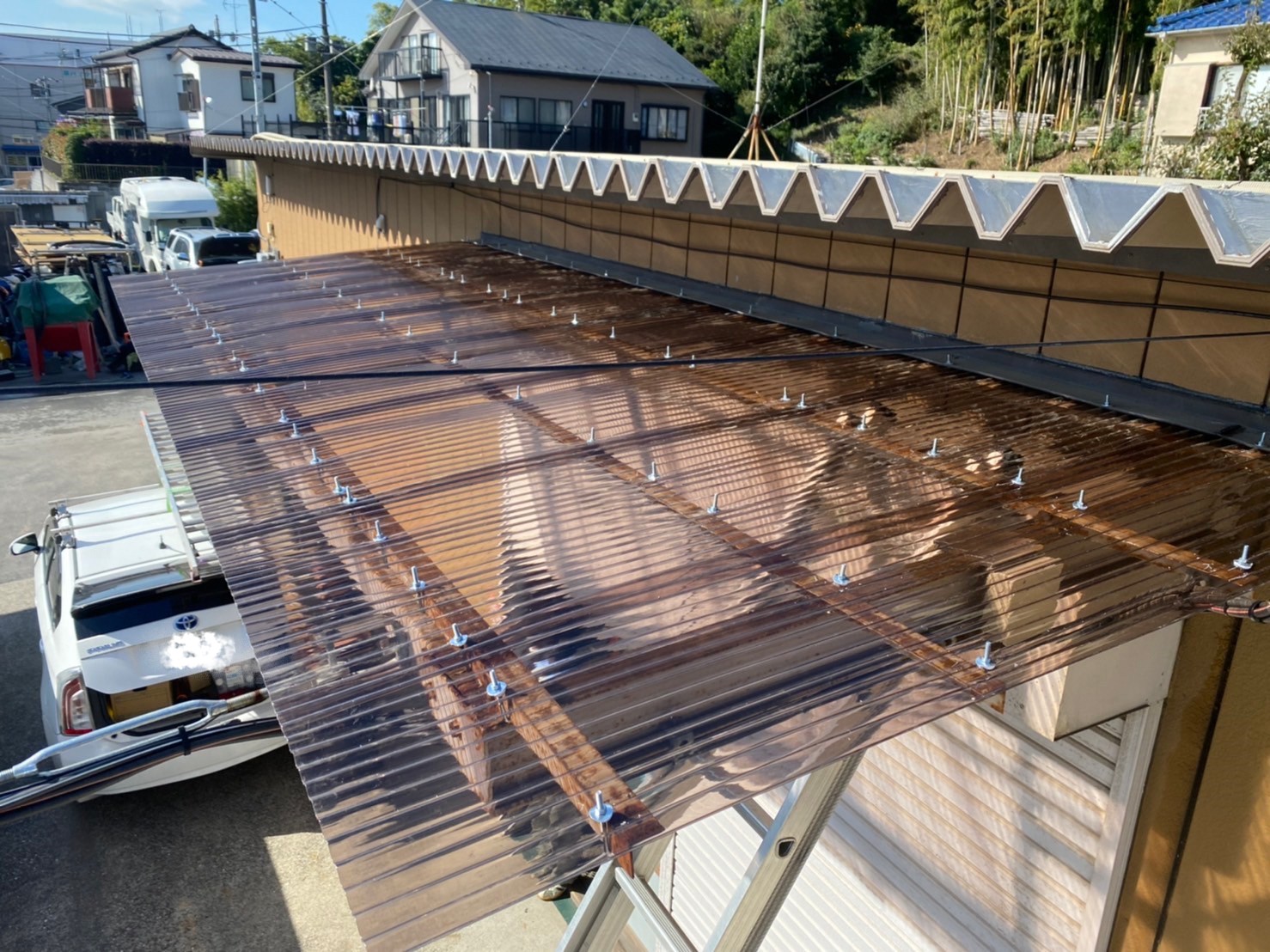 ポリカーボネートという素材の屋根材を使用し、新しく交換する方向で進めていきます。