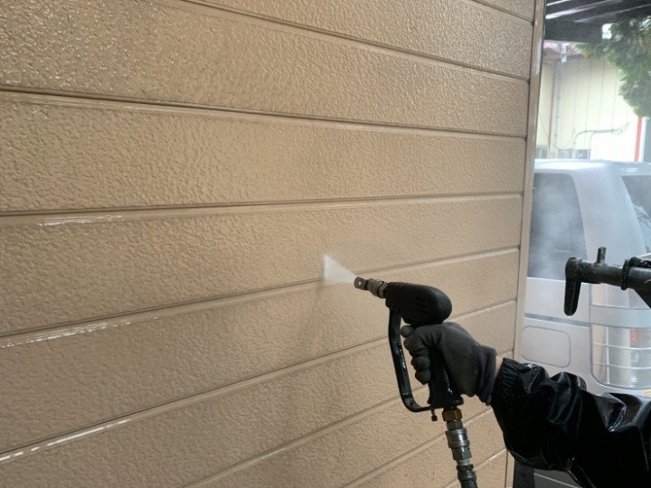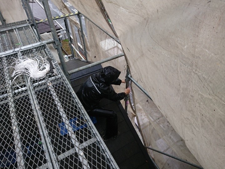 足場を組み、水や塗料の飛散防止用のメッシュシートで養生した後、高圧洗浄で汚れや苔、劣化した旧塗膜をしっかりと洗い流していきます。