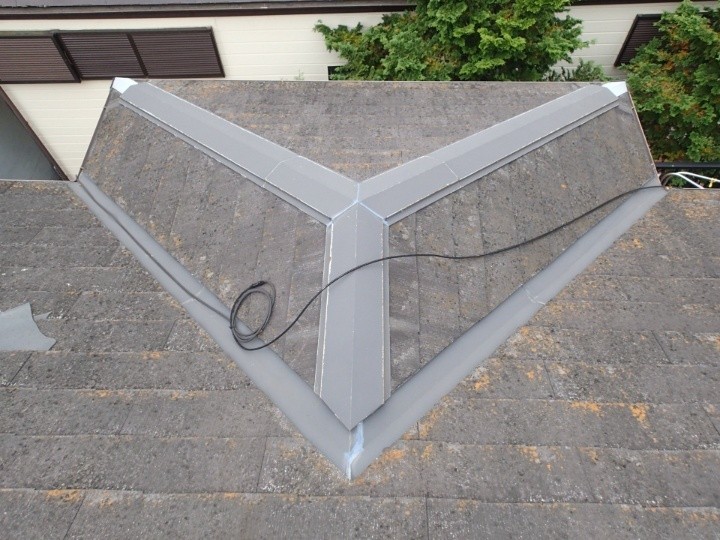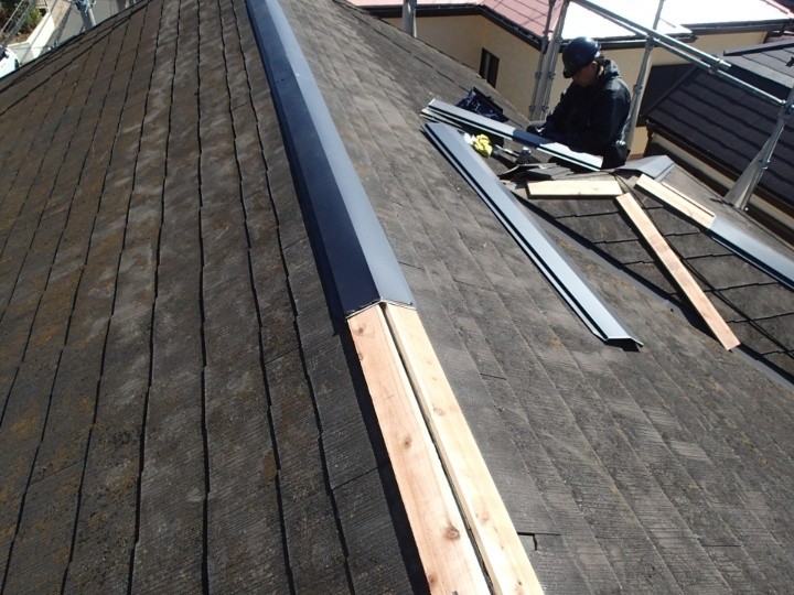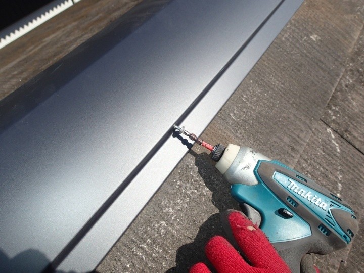 貫板の上に棟板金をかぶせた後、横からビスでしっかり固定して工事は完了です。