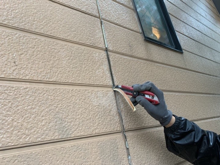 まず、目地シーリング材をカッターで切り取り、古いものを取り除いていきます。