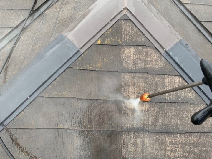 屋根材を傷めないよう、丁寧に汚れをそぎ落としながら清掃を行っていきます。