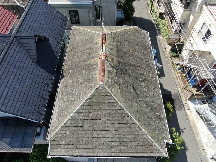 スレート全体には茶色い苔や汚れが広がり、表面塗膜の劣化が進んでいることがわかりました。