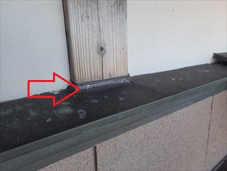 外部の状況です。サッシ廻りには他業者が行ったと思われる工事が施されています。庇があるため雨漏りの原因は、サッシ廻りではなさそうです。庇上部の状況を確認したところ、庇に使用されている板金と柱の接合部分に隙間があります。この部分と窓枠に出来た染みの位置になりますので、雨漏りの原因は、この隙間から雨水が浸水し雨漏りとなっています。