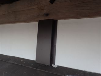 板金設置状況です。板金を設置する前に柱の下の部分に、コーキングを充填し板金を設置していきます。加工した板金は、柱を覆いさらに外側に板金をのビスことで、柱と漆喰壁の隙間で出来ても、板金を広げたことで、隙間を隠すことが出来ますので先を見越した板金を作成いたしました。