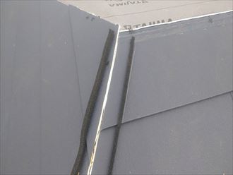 すべての棟板金の設置が完了後は、屋根上部の棟板金の合わさり部分に防水処置としてコーキングを充填します。充填する形状に合わせてマスキングテープを設置し、専用のヘラで形を整えます。