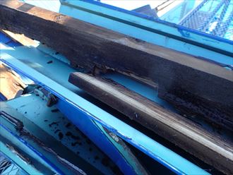 棟板金を固定するために設置されている貫板の状況を確認したところ、雨水の浸水による影響で腐食がかなり進行している状態でした(>_<)💦