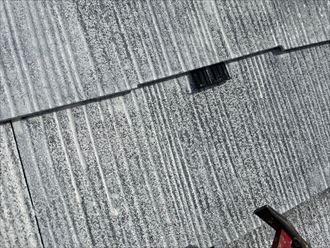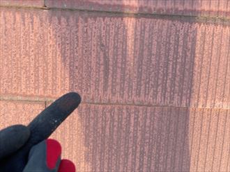 屋根、外壁共に状態の確認を行いました。外壁はクリア塗装が行われており塗料に艶も残りシーリングにも大きな傷みは無く良好な状態でした。しかし、屋根は高耐久塗料を使用して塗装を行なっても10年程で塗装にはチョーキングや色褪せが発生し劣化してしまいます。以前の塗装から9年経過していたので、色褪せやチョーキングといった劣化症状が全体的に見られました。塗装の劣化は撥水性や防水性の低下を招きスレート自体の傷みを進行させる原因となります。