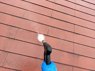 屋根塗装工事の様子になります。先ずは高圧洗浄による下地処理を行います。高圧洗浄を行うことで汚れや旧塗膜の除去を行います。旧塗膜は全て剥がれるわけではありませんが密着が弱くなっている部分に関しては剥がすことが可能です。